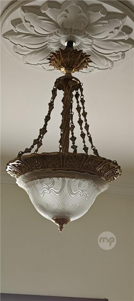 A pair (2) of solid brass antique/contemporary chandeliers with glass shade. In perfect excellent condition. €70each.