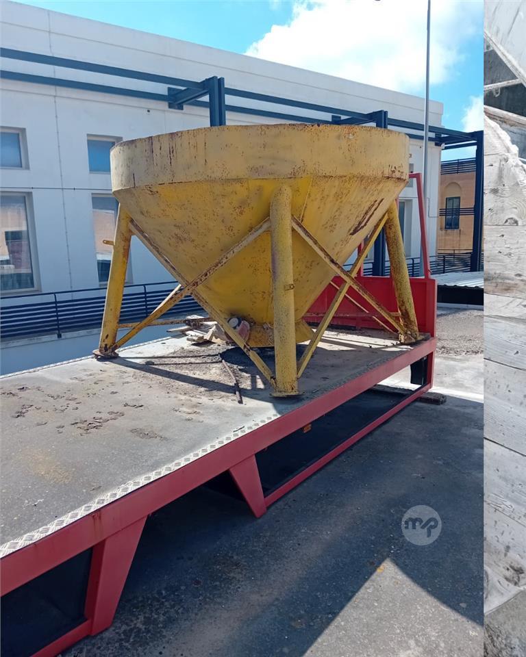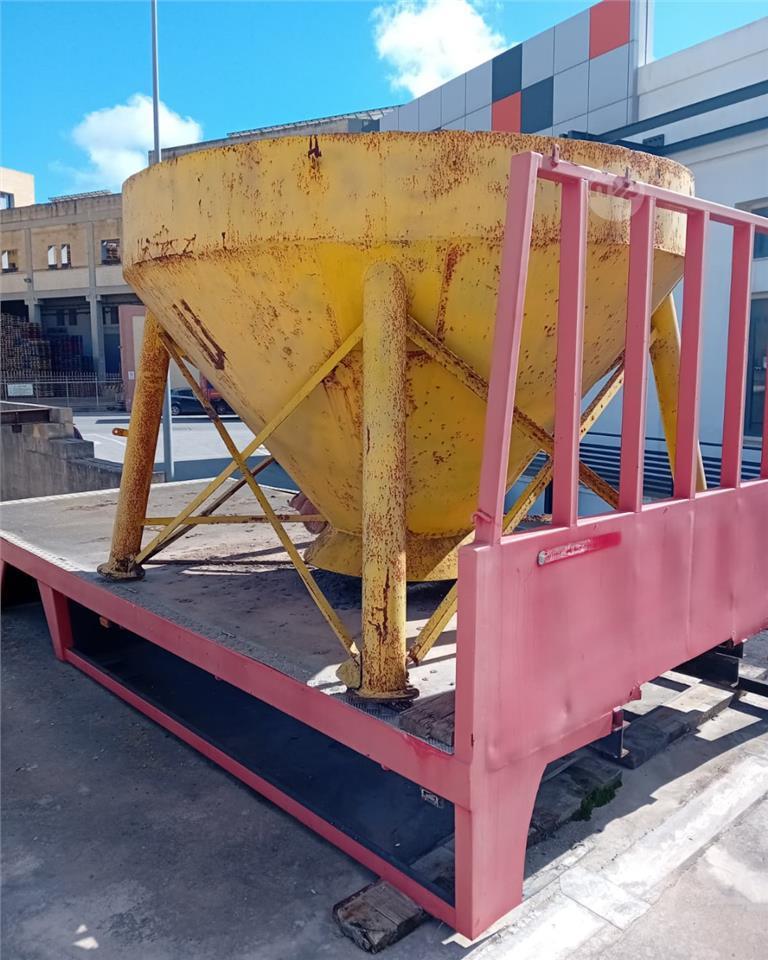 Heavy-duty yellow conical hopper with generous capacity, built for reliable storage and controlled dispensing of bulk materials like aggregates, sand, cement, or similar. Features a wide top opening for easy filling and a tapered base for efficient gravity flow – solid, weathered construction that's proven tough on sites over the years. Currently mounted on a separate transport platform (not included), ready for relocation or immediate site use.