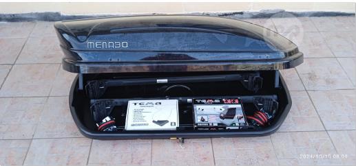 I'm selling a Menabo roof box complete with aluminum bars and all the necessary mounting hardware. Used only twice. Suitable for various car models, as shown on the attached leaflet in the photo. The price is negotiable.