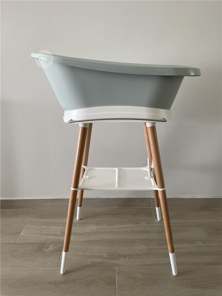 Baby bath with a stand, newborn support, digital unit and drain pipe.
