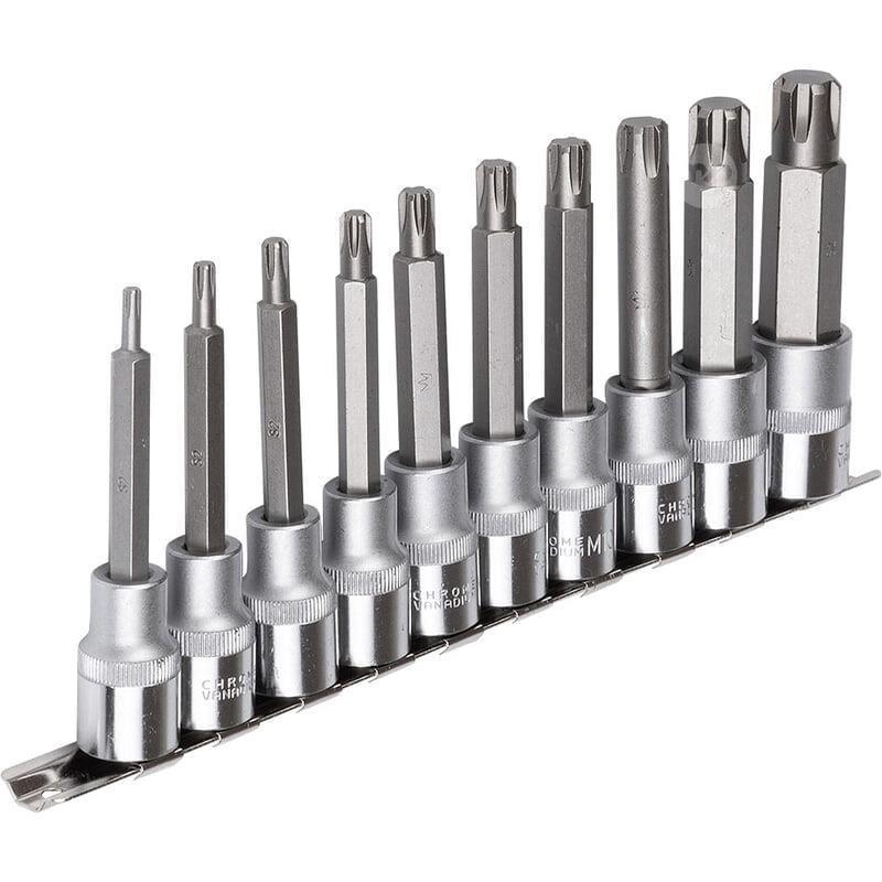 Set of 10 RIBE hexagon keys with ½” handle in the size range M4-M16 placed on a metal rail.
