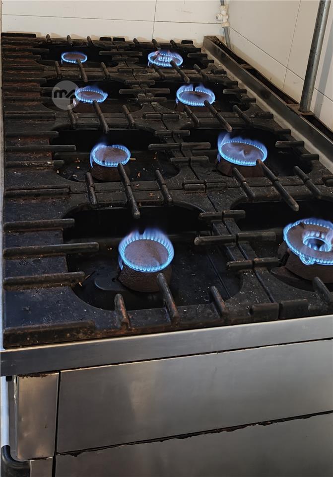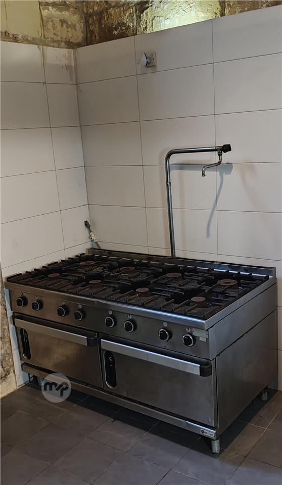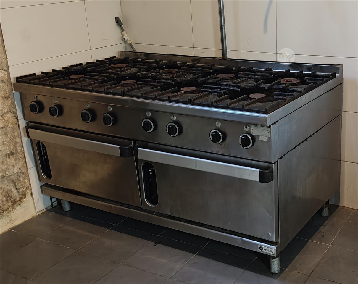 Stainless steel industrial cooker featuring 8 burners and 2 ovens. In good working condition.