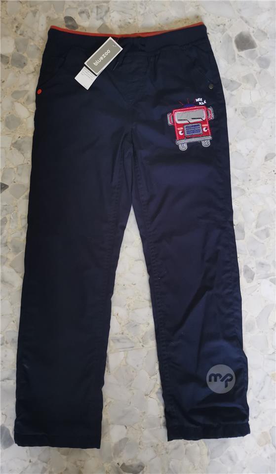-Dark blue lined comfortable trousers with an elasticated waist with a fire engine on the front.