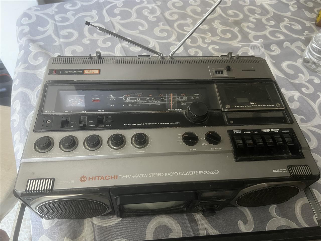 A vintage 1979-1980 Hitachi This item is a vintage Hitachi TV-FM/MW/LW stereo radio cassette recorder from the late 1970s or early 1980s.