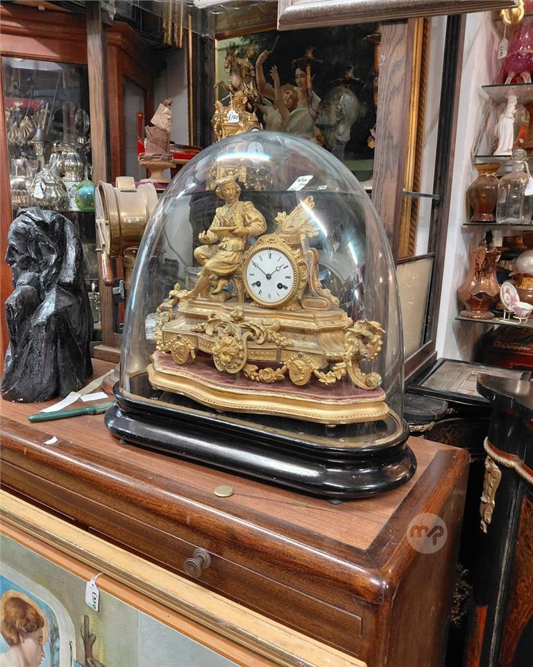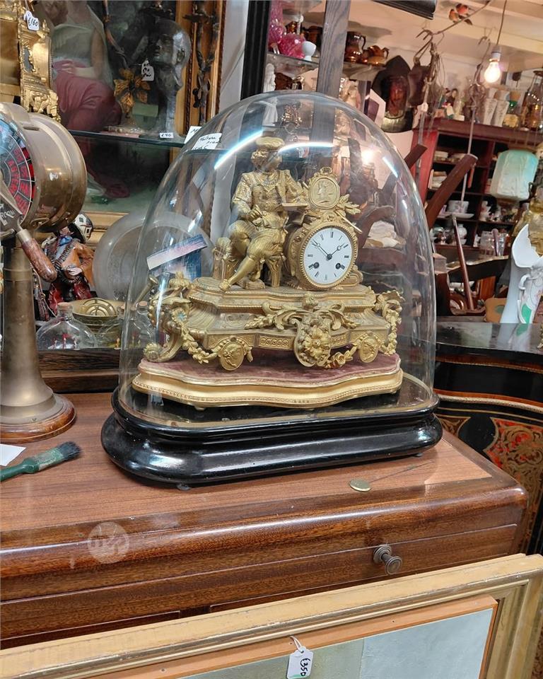A Large Genuine Antique French gilt, large Mantle clock under its original glass dome Gilded bronze Showing a Noble Man figure "writer" Beautiful condition throughout Measures 55x50 cm Price