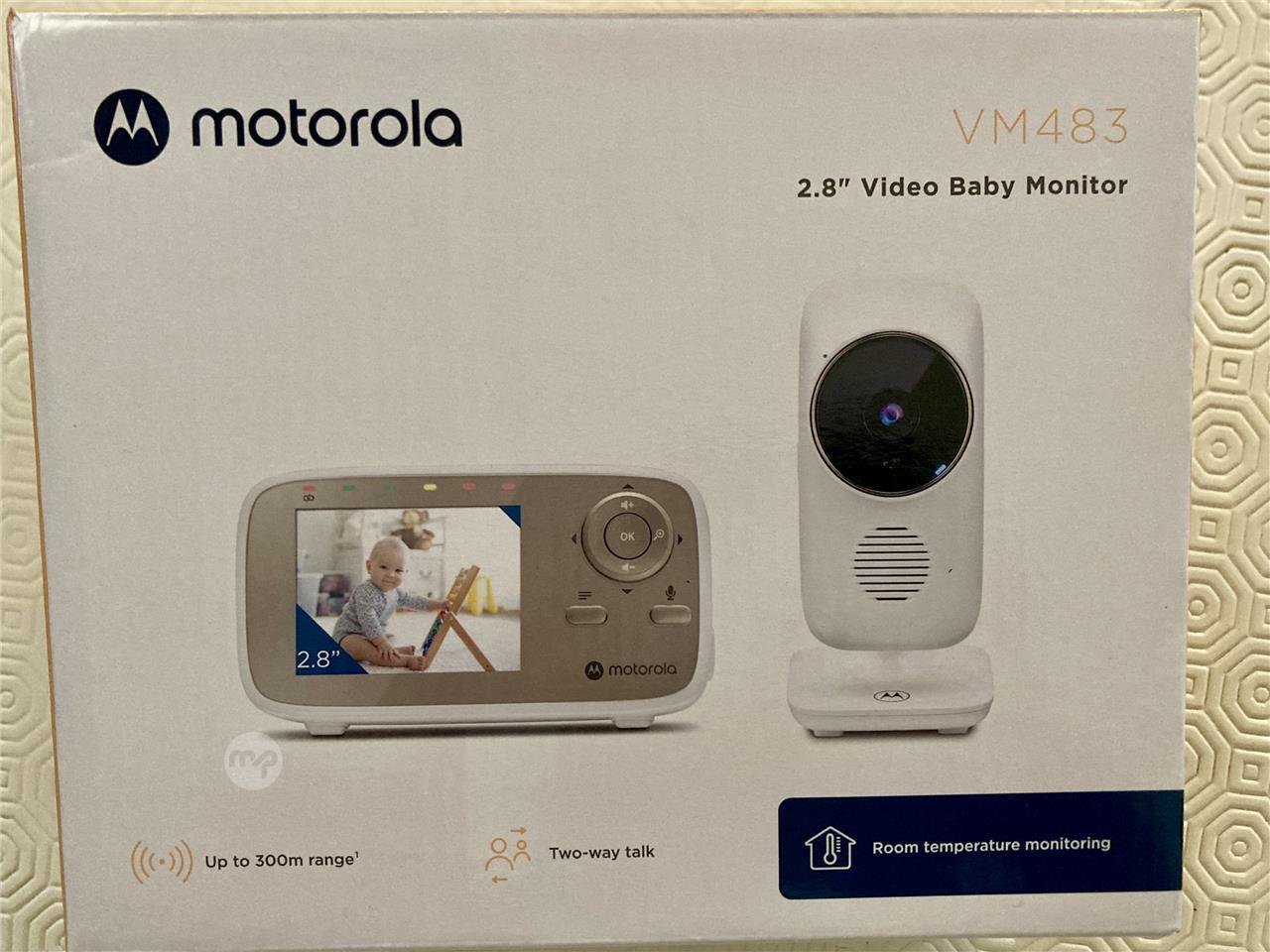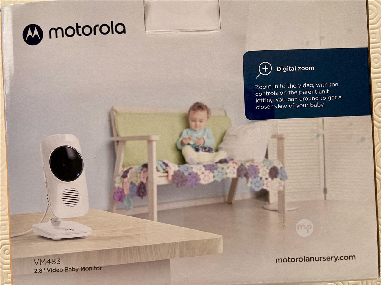 Motorola 2.8inch video baby monitor. Digital zoom to get closer look of your baby. Infrared night vision, volume control, high sensitivity microphone, 2.4 GHZ FHSS wireless technology for in-home viewing. Used like new with original box