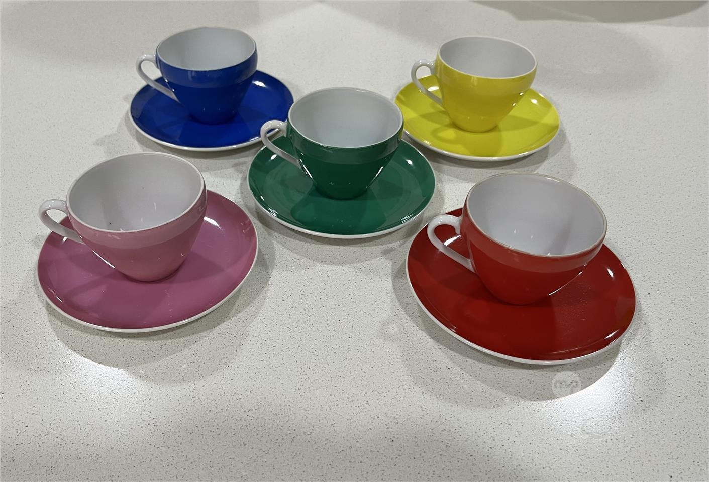 5 small espresso cups with saucers.