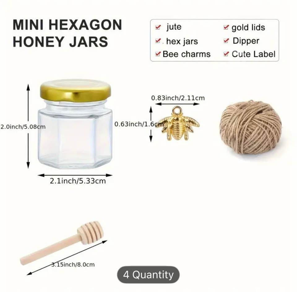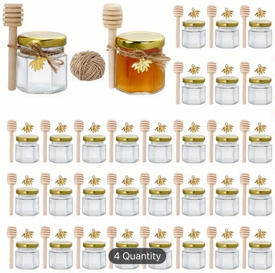 Set of 150 empty glass honey jars, complete with gold lids, gold bee charms, serving spoon and twine.