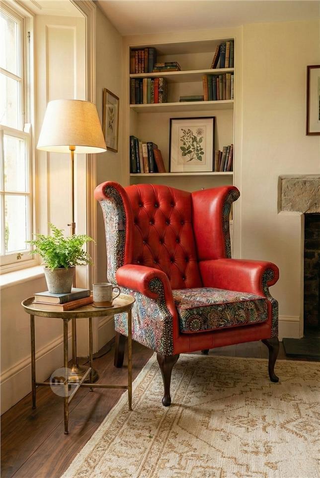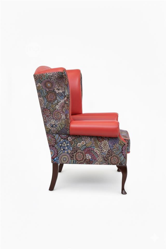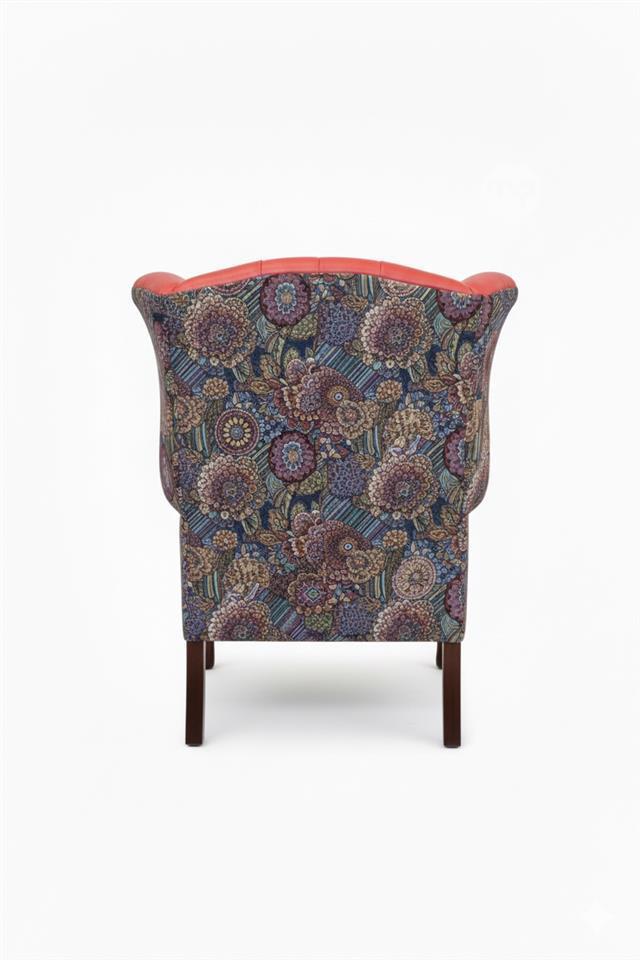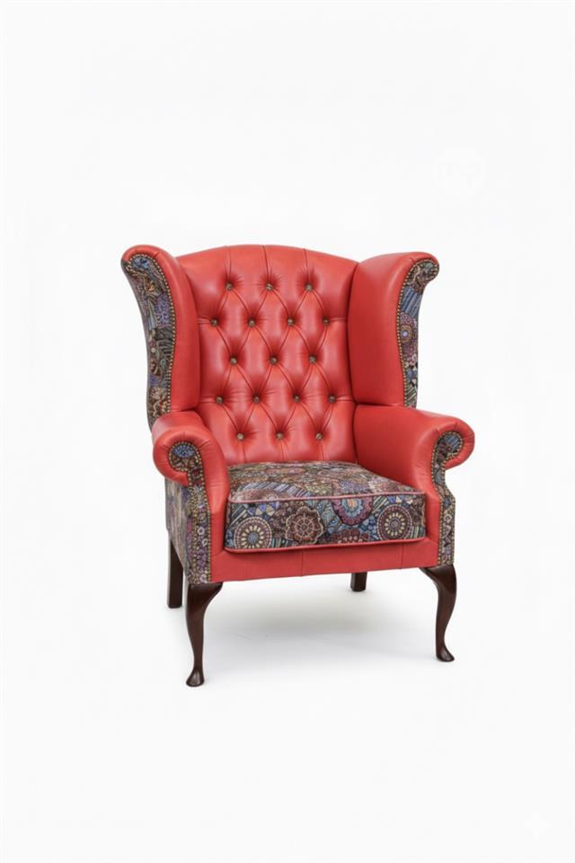 This striking Chesterfield armchair features a bold combination of red genuine leather and richly detailed patchwork fabric, creating a perfect balance between classic British design and contemporary character.