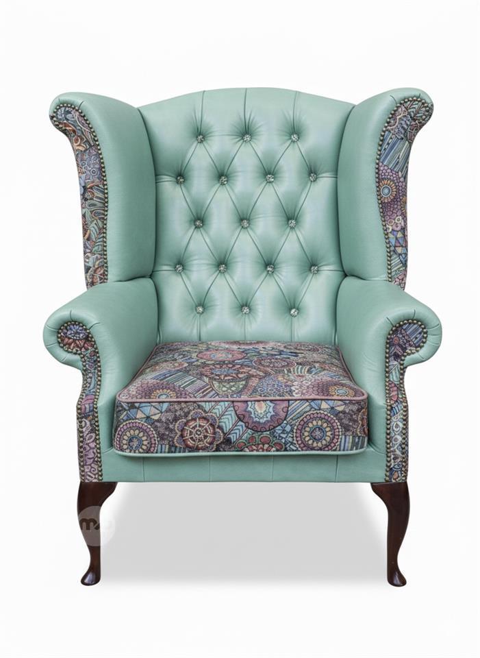 This elegant Chesterfield armchair is upholstered in mint green genuine leather and enriched with carefully selected patchwork fabric, creating a refined yet distinctive look. The soft mint tone adds freshness and lightness, while the classic Chesterfield form ensures timeless appeal.
