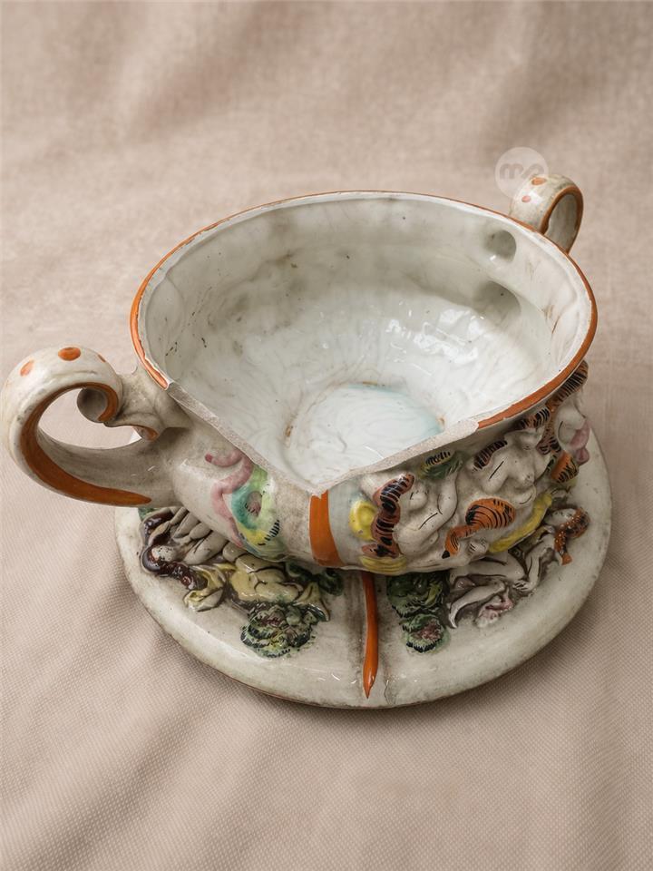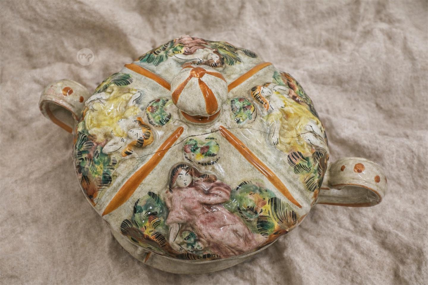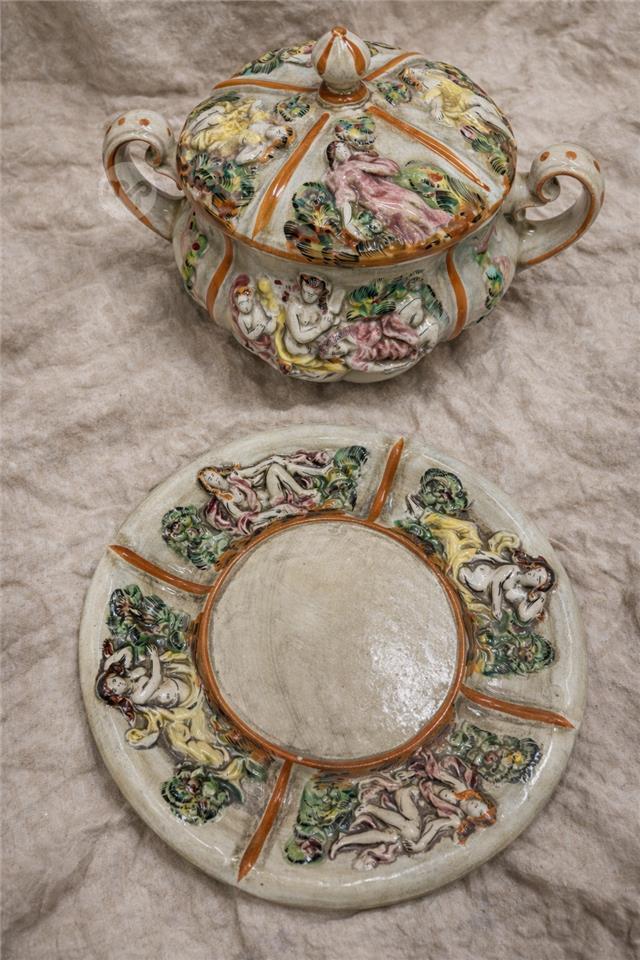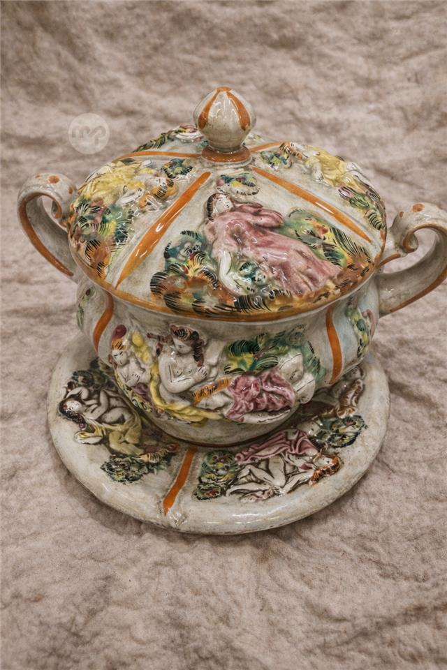 Vintage decorative porcelain piece with detailed relief design and classical figures.