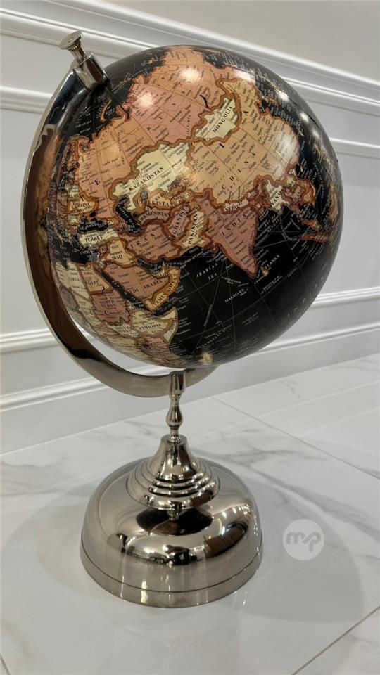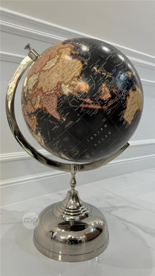 This elegant decorative globe stands at an impressive 75 cm in height, making it a striking statement piece for any room. It features a rich vintage-style world map with warm earthy tones contrasted against deep black oceans, giving it a classic, antique aesthetic. The globe is supported by a sleek, polished metal axis and a sturdy, reflective base, adding a touch of modern sophistication.
