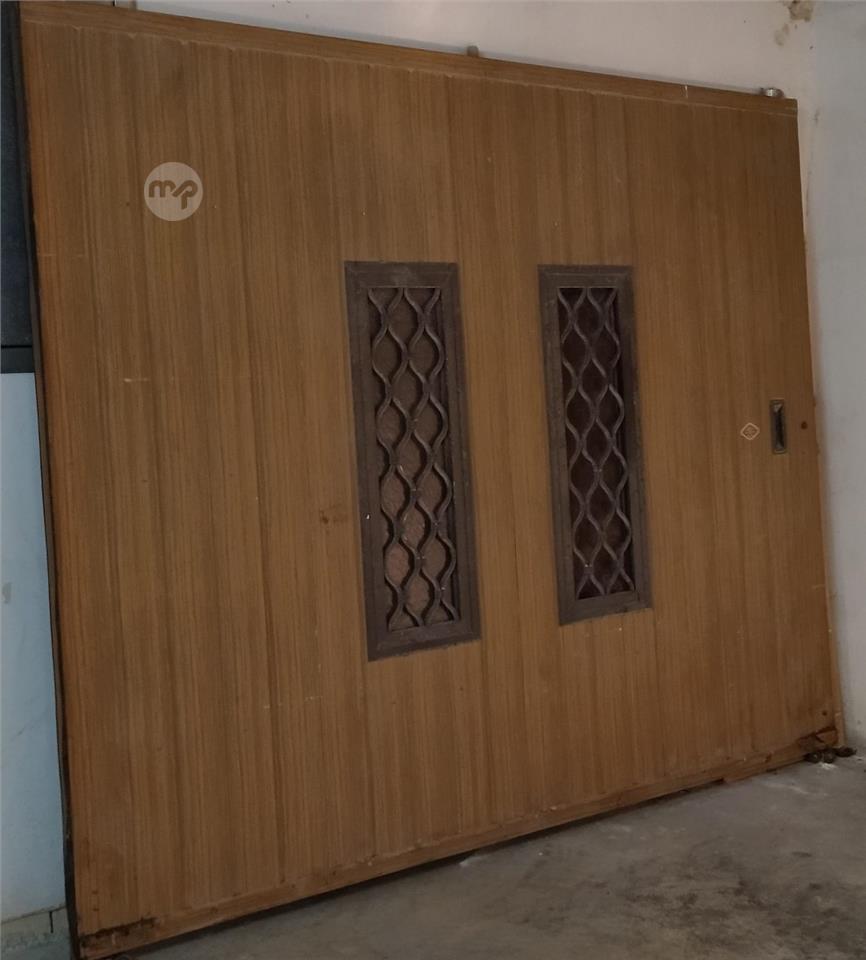 FGP metal garage door in oak finish with two windows with sliding mechanism inclusive of motor. Measurements 210cm high and 265cm wide in very good condition.