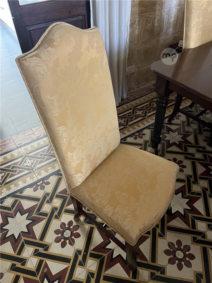 An elegant set consisting of 10 chairs and 2 carver chairs upholstered in pretty gold fabric. In excellent condition and very comfortable. PM if interested on 99346616. Pick up from Lija.