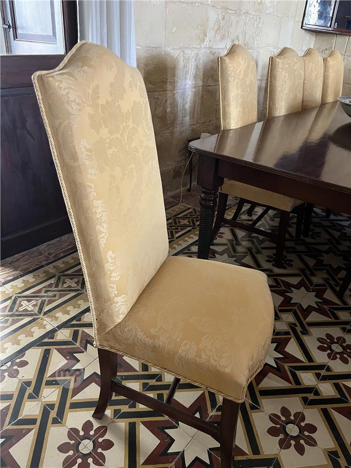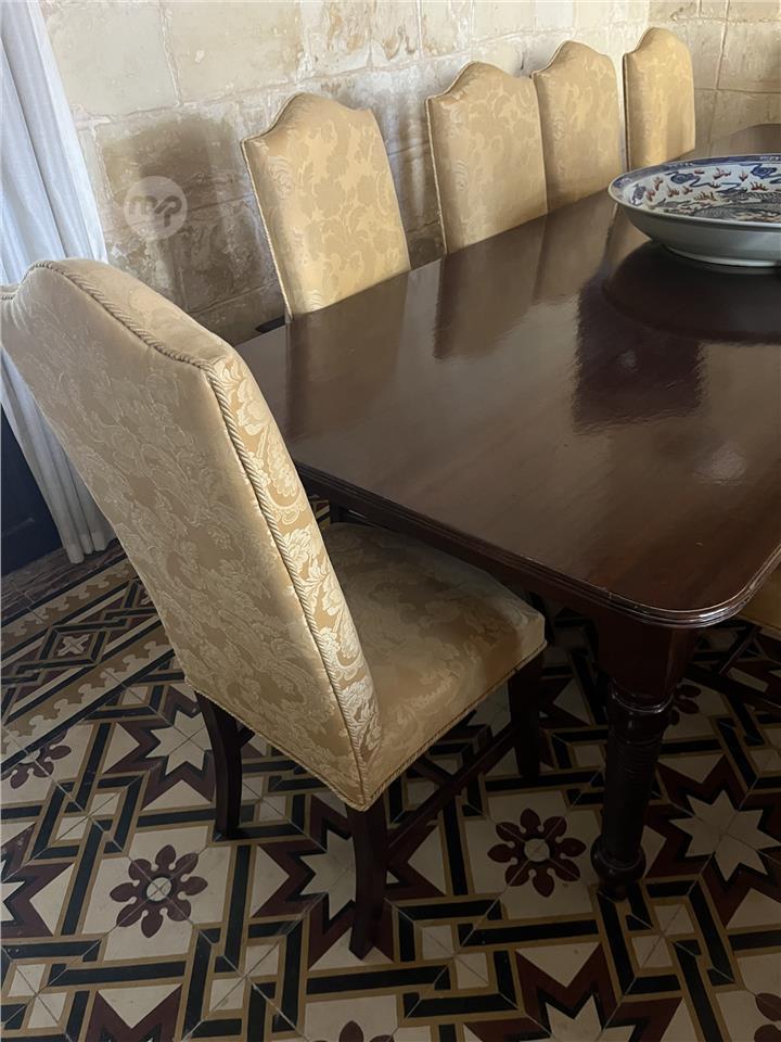 A beautiful, solid wood dining table (303 x 114 x 76cm) with 10 chairs and 2 carver chairs in beautiful gold fabric. Great condition. Pick up from Lija. Message me on 99346616.