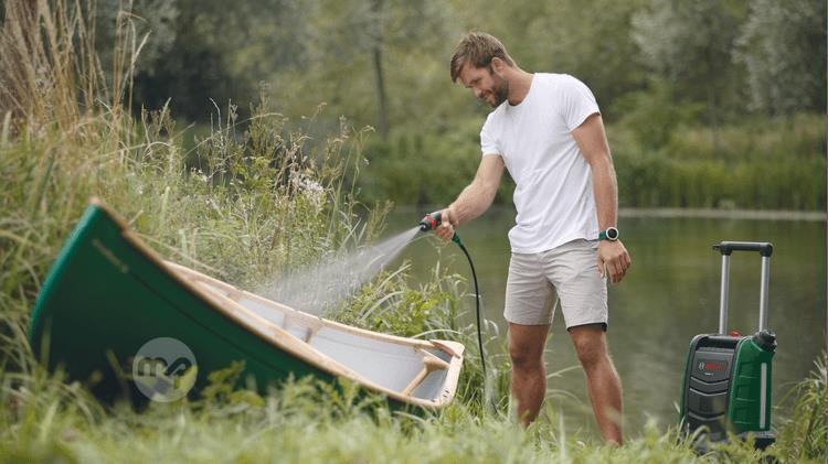Quick assembly and convenient handling: the Fontus 18V cordless pressure washer allows for quick and easy cleaning. Unlike traditional pressure washers, this handy pressure washer is suitable for home and mobile use thanks to its water connection, integrated 15-liter tank, and 18V battery. Adjustable pressure and four different jet patterns are available: a spot jet for stubborn dirt; a 15° fan jet for precise cleaning of small surfaces; a 50° fan jet for washing large surfaces; and a wide jet for gentle cleaning. The attachable SmartBrush attachment is ideal for gently cleaning large surfaces, such as cars or garden furniture. And the accessory compartment and gun holder during use make cleaning even easier. This tool is part of the POWER FOR ALL ALLIANCE. The same battery can power a wide range of tools from various brands.