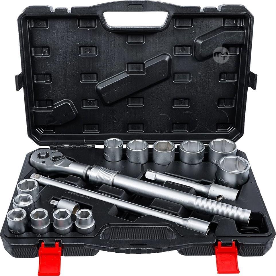 Ideal for powerful use on commercial vehicles, tractors and machines. Compact set combination with 12 socket spanner inserts from 19 - 50 mm, 2 extensions 200 and 400 mm and a socket wrench adapter from 20 mm (3/4 inch) to 12.5 mm (1/2 inch)