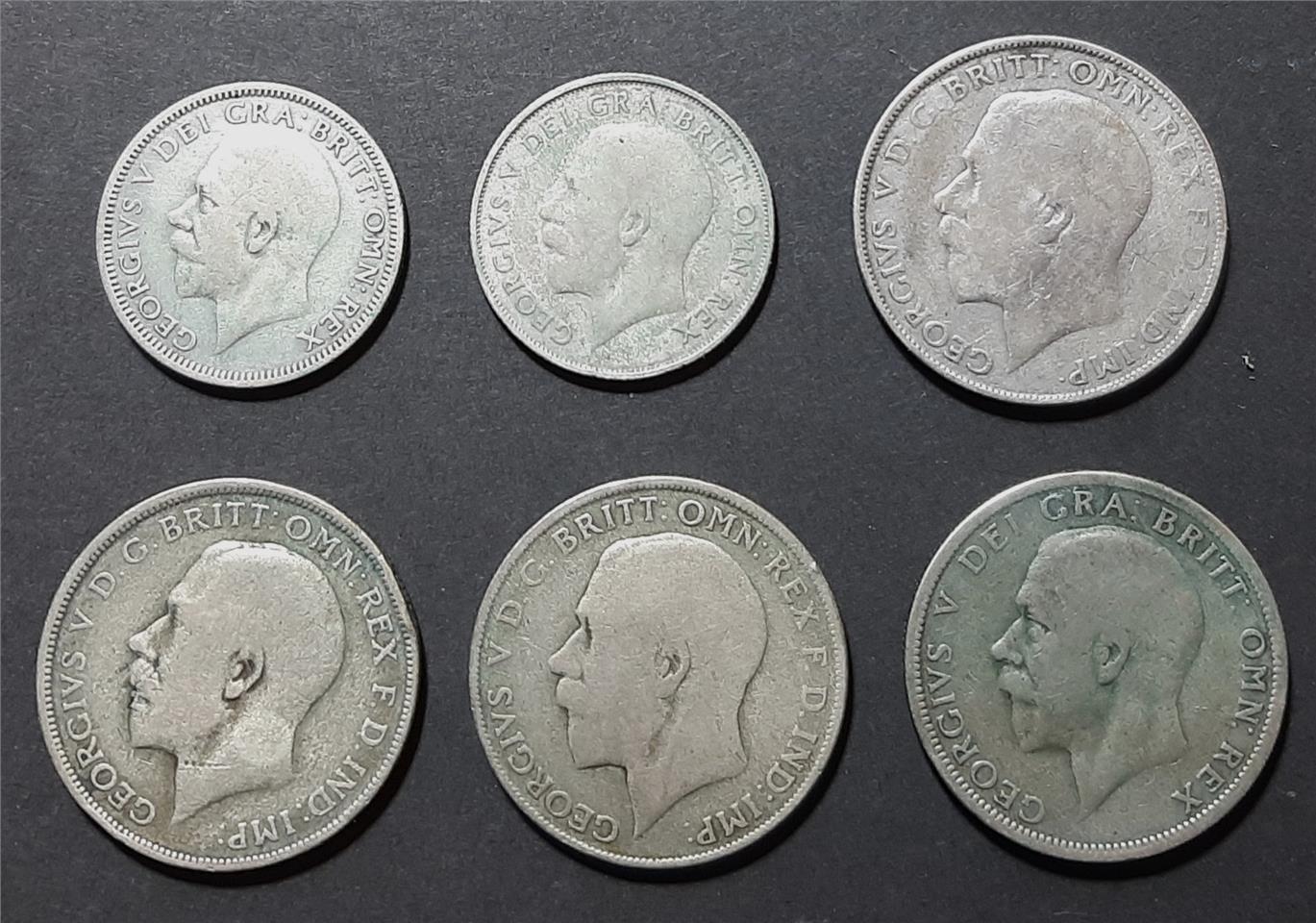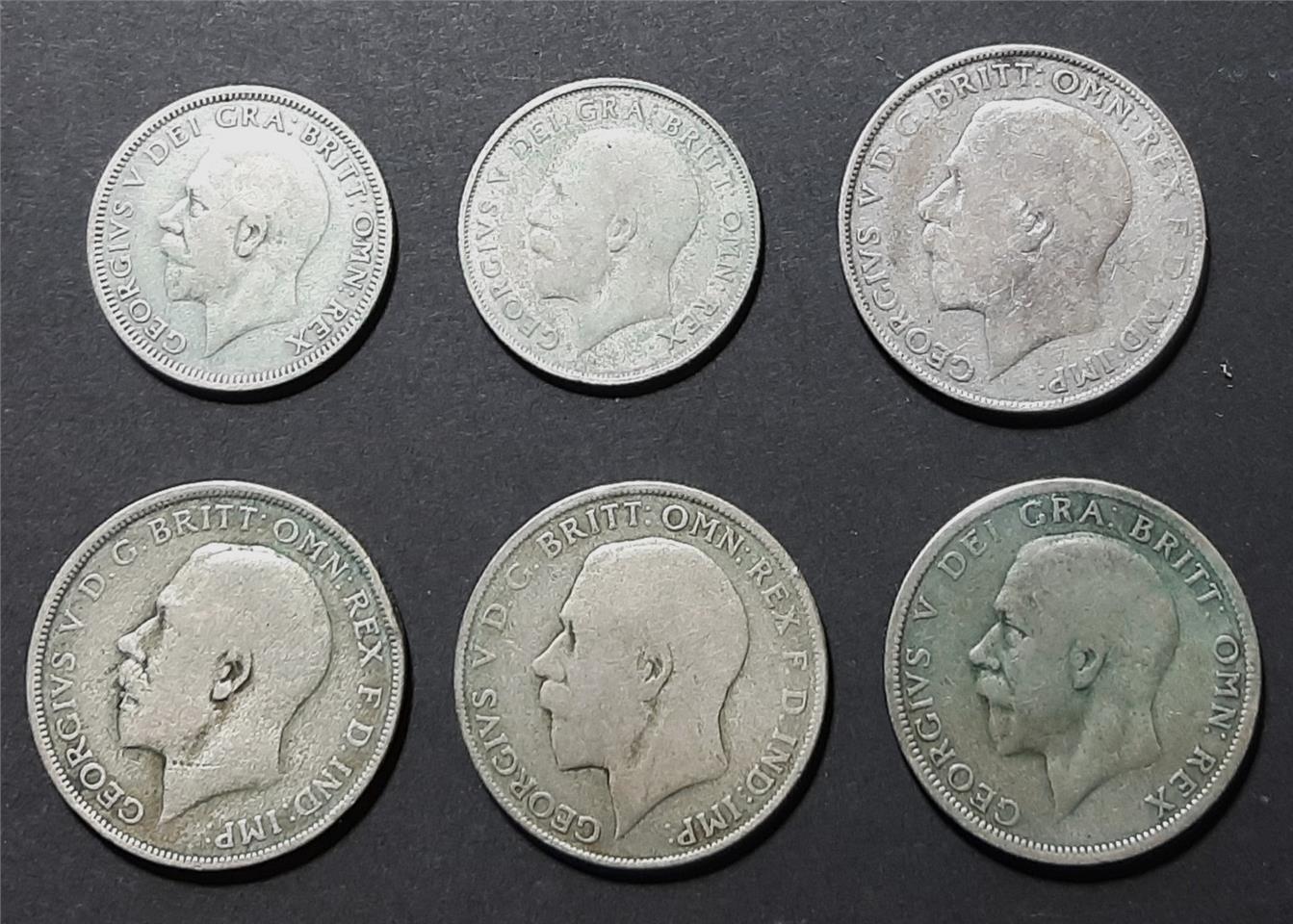 6 KING GEORGE V SILVER (.500) COINS - 2 ONE SHILLING and 4 FLORINS (TWO SHILLINGS) - 54.7g