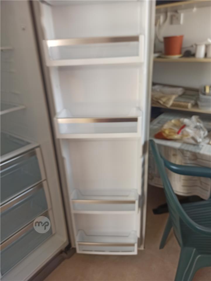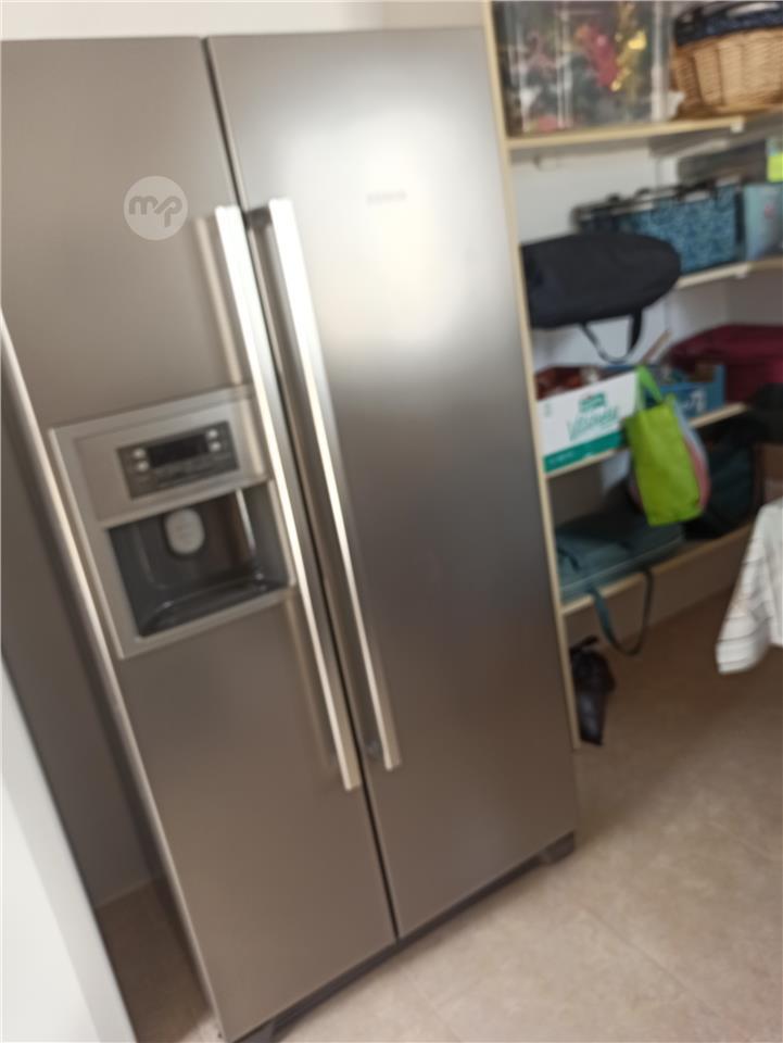 Two door Bosch stainless steel fridge freezer with ice maker and water dispenser.