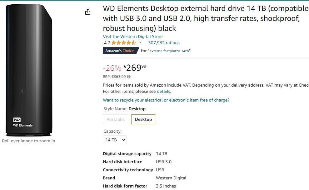 2 units: WD Elements Desktop External HDD 14TB with USB 3.0