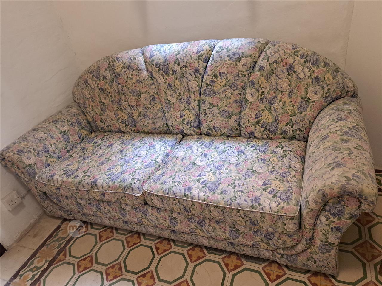 Sofa and armchair in a flowered material.Sofa measuring 195 cms wide x 94 cms deep, armchair with wooden frame measuring 64cms wide x 66cms deep.
