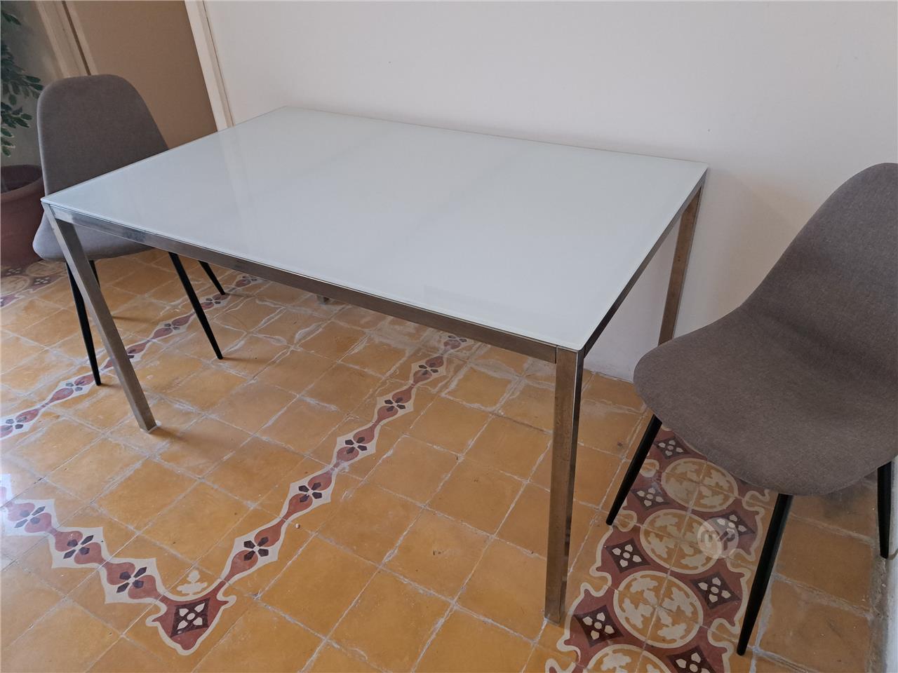 2 white glass tables with chrome legs, each measuring135cms x 85cms x 74cms. Eur 40 each.