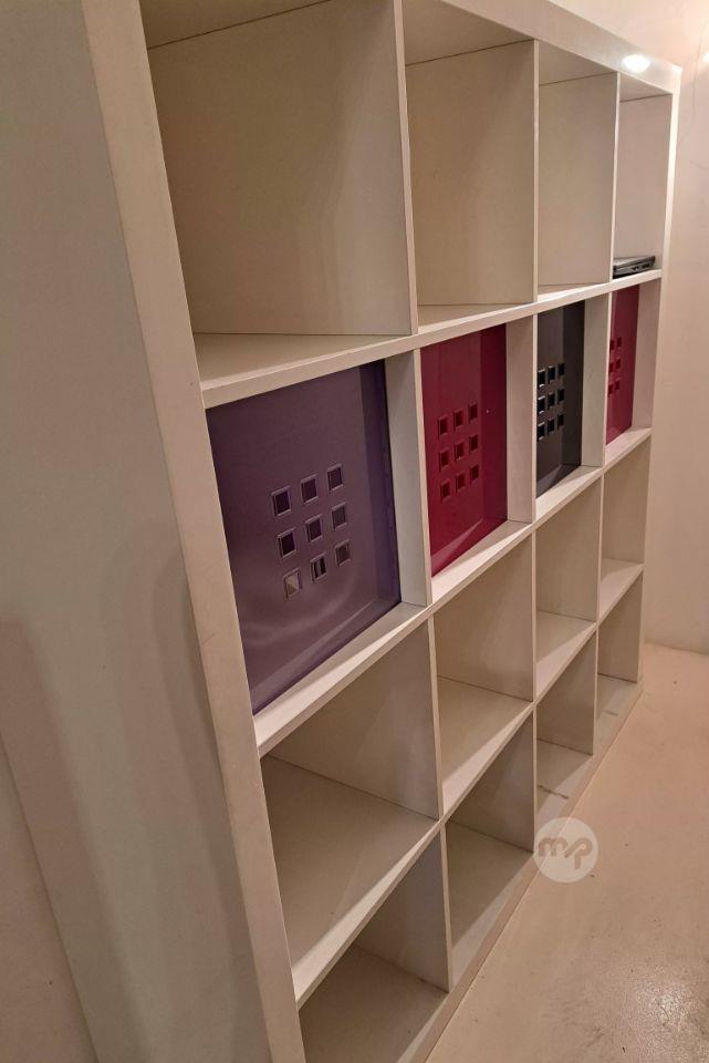Library with storage cubes, measuring 150cms x 150 cms x 39cms. Transport arrangements must be made by the buyer.