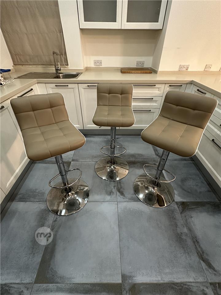 Set of 3 modern adjustable bar stools in excellent condition, perfect for a kitchen island, breakfast bar, or modern dining area.