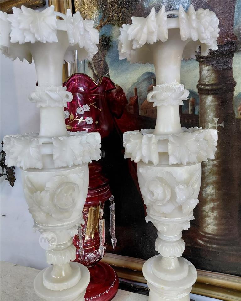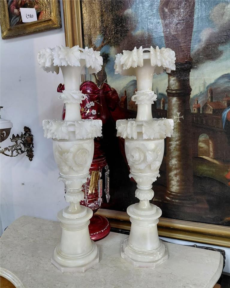 Pair large,62 cms long , Antique Carved Alabaster vases Italian 19th century Intricate carvings of Roses and leaves Price of 450 euros both 99456526