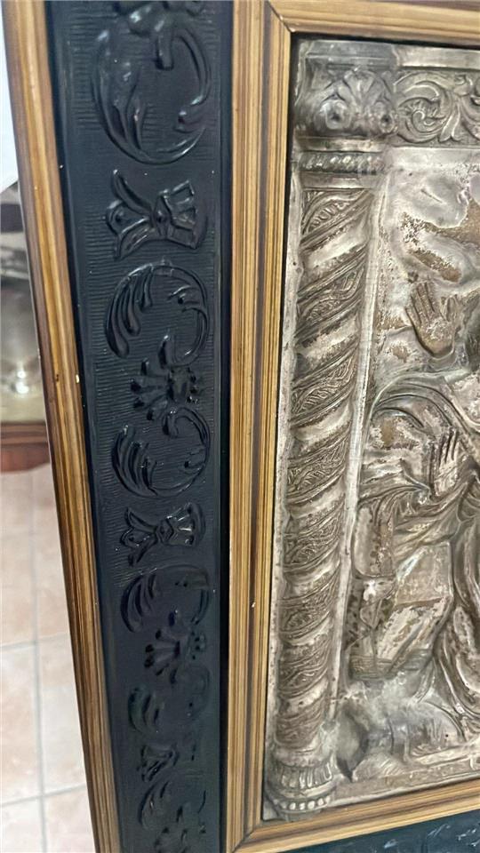 Crafted in raised metal with fine detailing and set in a dark framed surround with gold‑tone inner trim. Spanish inscription at the bottom. A classic piece of Catholic devotional wall art, likely dating from the mid to late 20th century. Ideal for religious décor, collectors, or traditional home interiors.