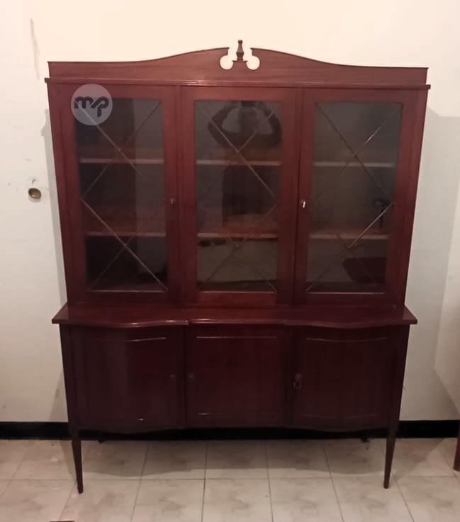 Elegant vintage display cabinet in a rich mahogany-toned finish, featuring glazed upper doors for display and lower cupboard storage. Ideal for glassware, books, décor, or dining room storage.