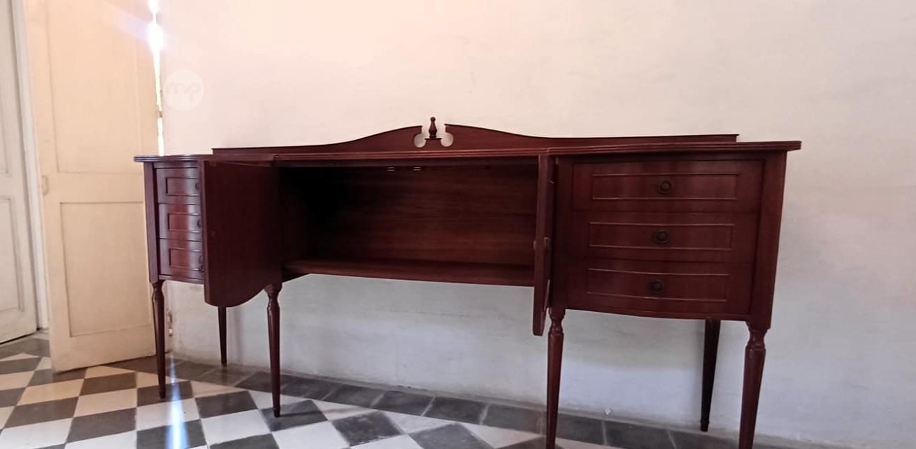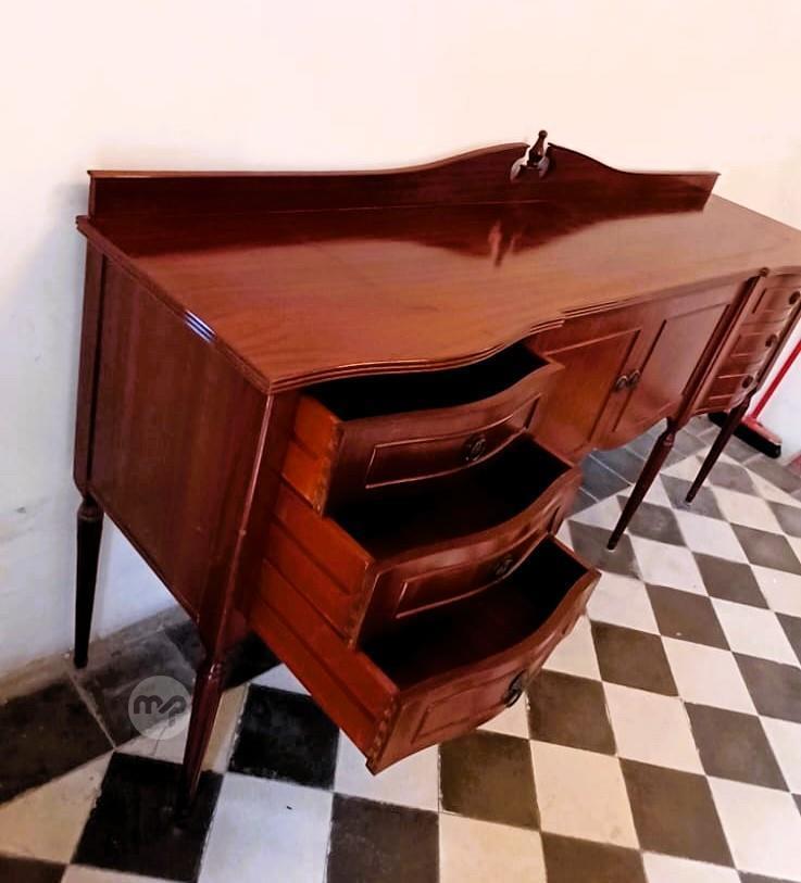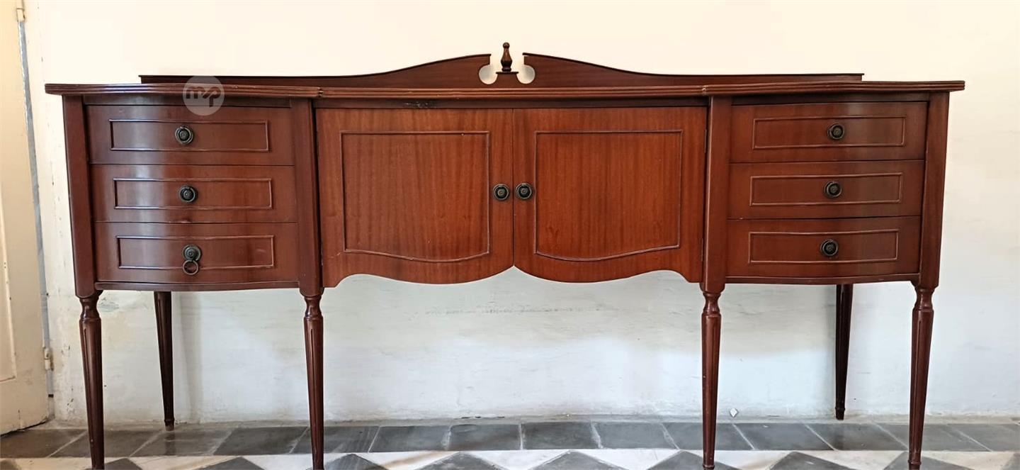 Elegant vintage wooden sideboard with a rich mahogany-toned finish, six drawers, and a central double-door cupboard. A practical and decorative statement piece, ideal for dining rooms, hallways, or traditional interiors. Measures 199cm x 47cm x 98cm. Pickup from a 1st floor townhouse in Paola.