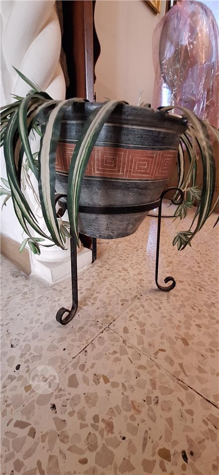 Decorative ceramic plant pot with vintage metal stand.
