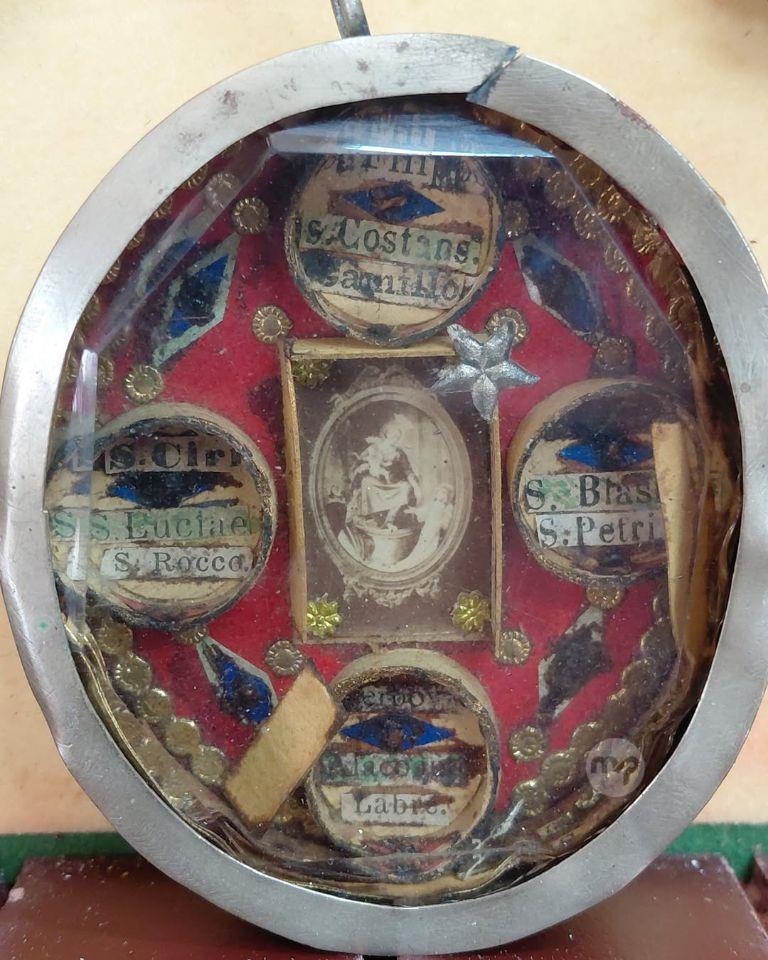 Lot of 7 Antiques Religious Relics, all Mounted in small frame