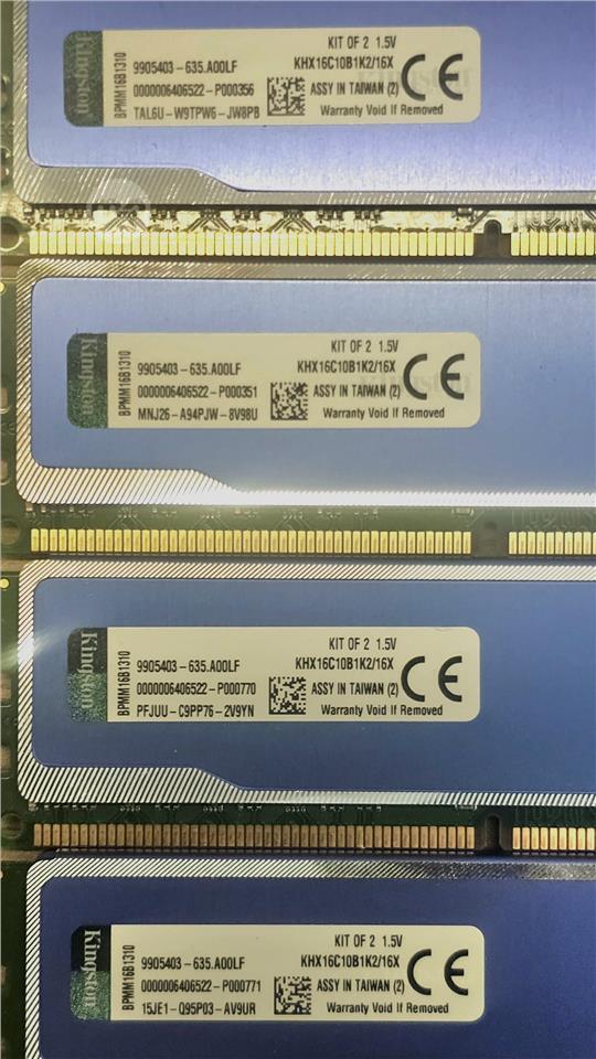 Selling four sticks of Kingston HyperX Blu DDR3, all identical part number KHX16C10B1K2/16X. 32GB total (4x8GB), 1600MHz, CL10, 1.5V, XMP support. All four from the same part number — can populate a full quad-channel or dual-channel board. Pulled from a working system. Perfect for an older gaming or workstation build needing a budget 32GB upgrade. price for all four sticks 40