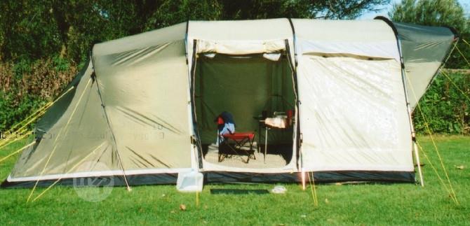 Great family tent has three rooms (2 sleeping rooms, I kitchen/sitting) plus canopy. This tent has steel poles and is very sturdy in rainy and/or windy conditions.