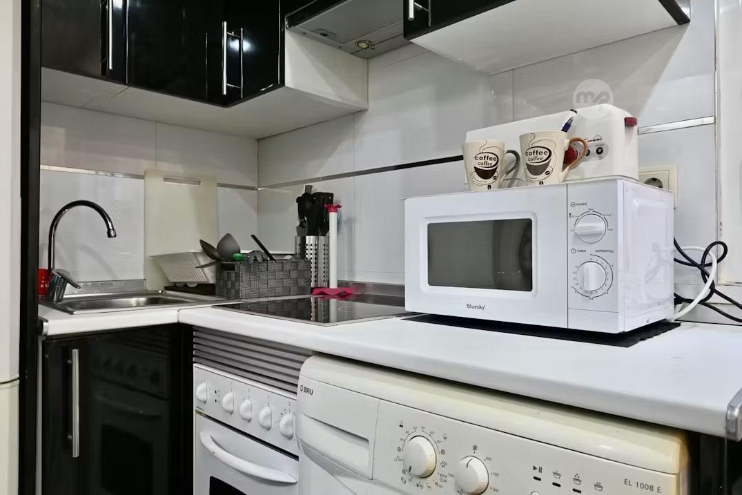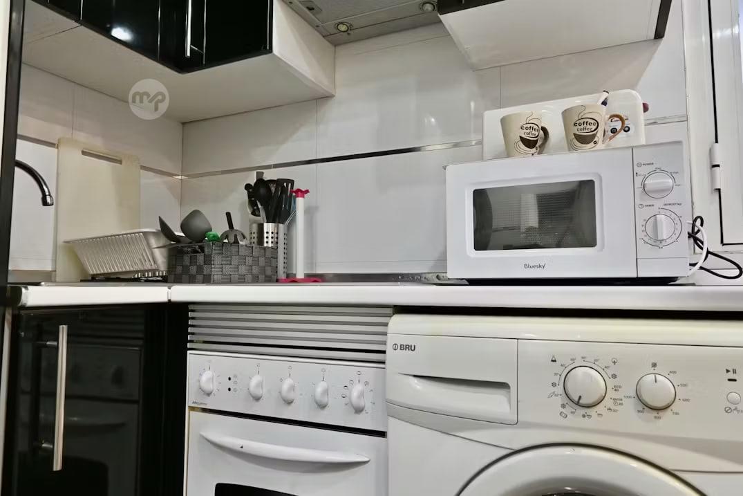 This 40m² studio offers a perfect balance of comfort and functionality, ideal for couples or single professionals. The space includes a comfortable double bed, a dining area for two, and a fully equipped kitchen with hob, fridge, microwave, and all essential utensils.