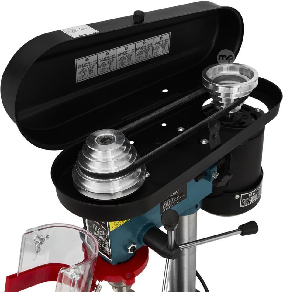 The device is driven by a V-belt and offers 5-speed speed adjustment, allowing for adjustment of parameters to the type of material being processed and the drill diameter. An adjustable work table with adjustable height and drilling depth ensure high application flexibility and user comfort.
