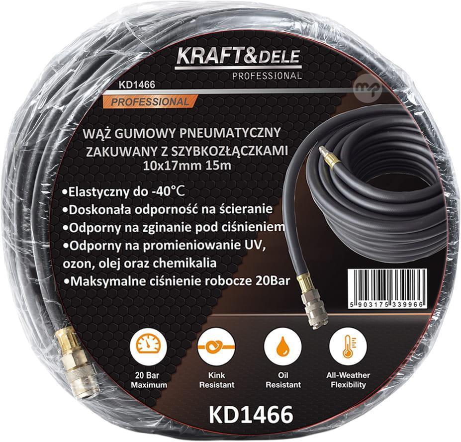 The KD1466 is a durable and flexible 15-meter KRAFT&DELE pneumatic hose made of oil- and weather-resistant rubber. Standard quick-connect couplings ensure quick and convenient connection to pneumatic tools and devices.