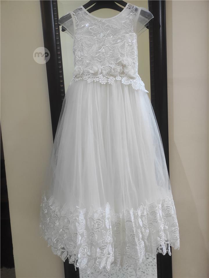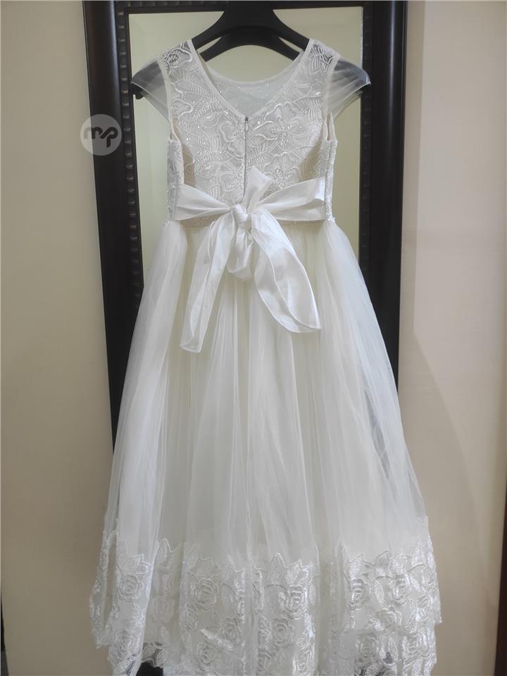 A size 10 holy communion dress with a tulle and lace skirt and a lace bodice with a sparkling effect. With sewn in cap sleeves and worn only once. Matching veil to be given free with dress