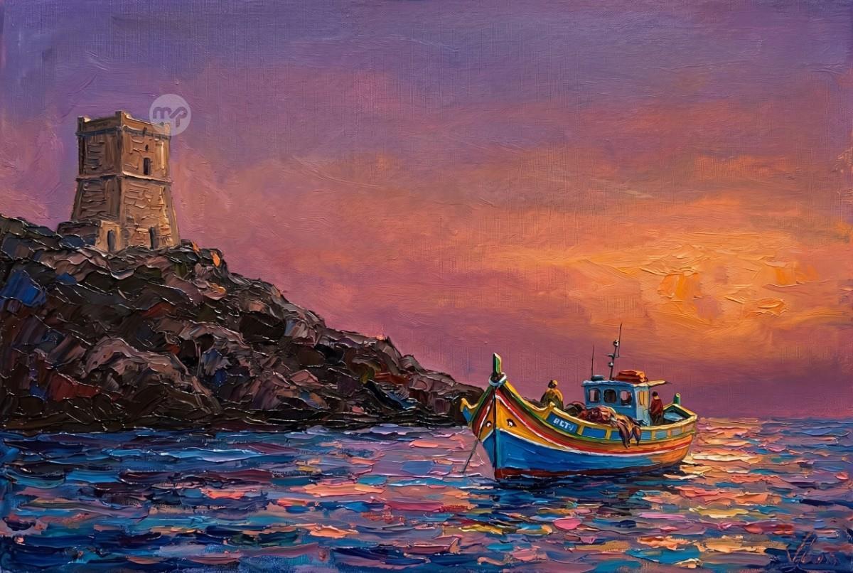 SUNSET ON XLENDI TOWER GOZO --- ORIGINAL HAND PAINTING OIL ON CANVAS 70X50
