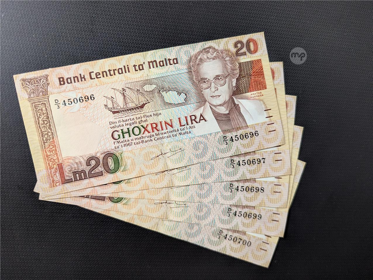 Set of 5 consecutively numbered Malta banknotes, in very fine grade going at a bargain price.