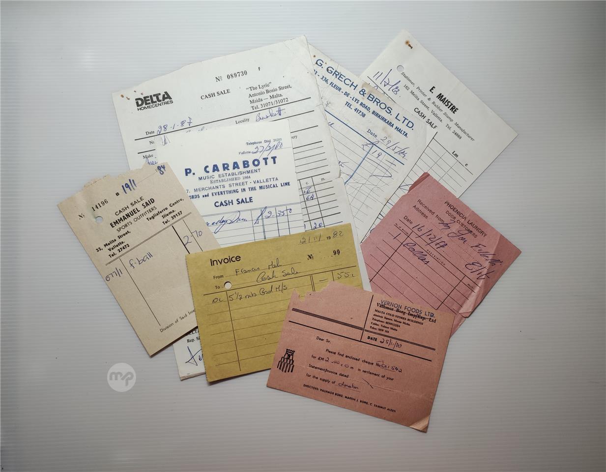 A collcetion of Maltese 1980s invoices - Kollezzjoni ta' rcevuti mis-snin tmenin