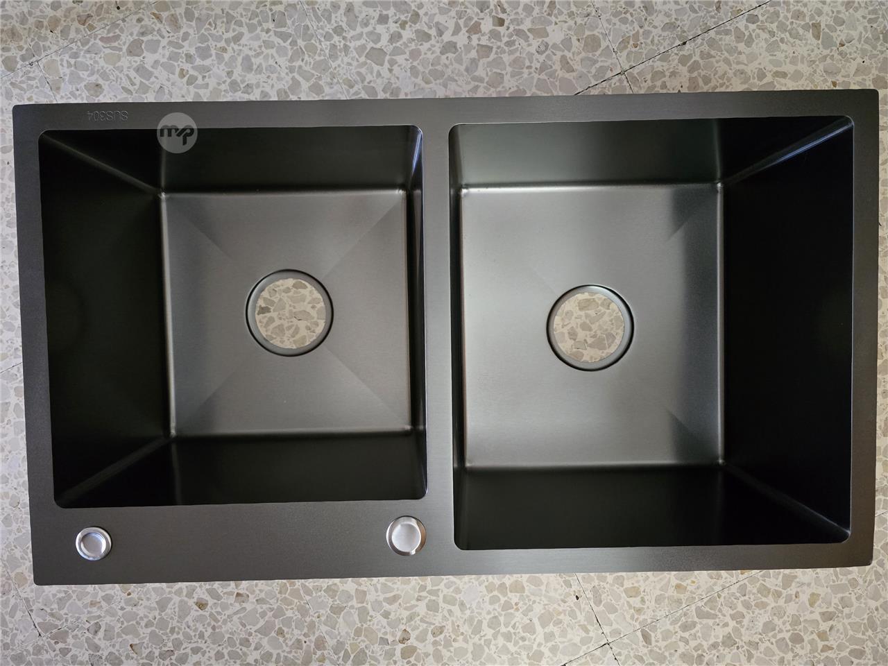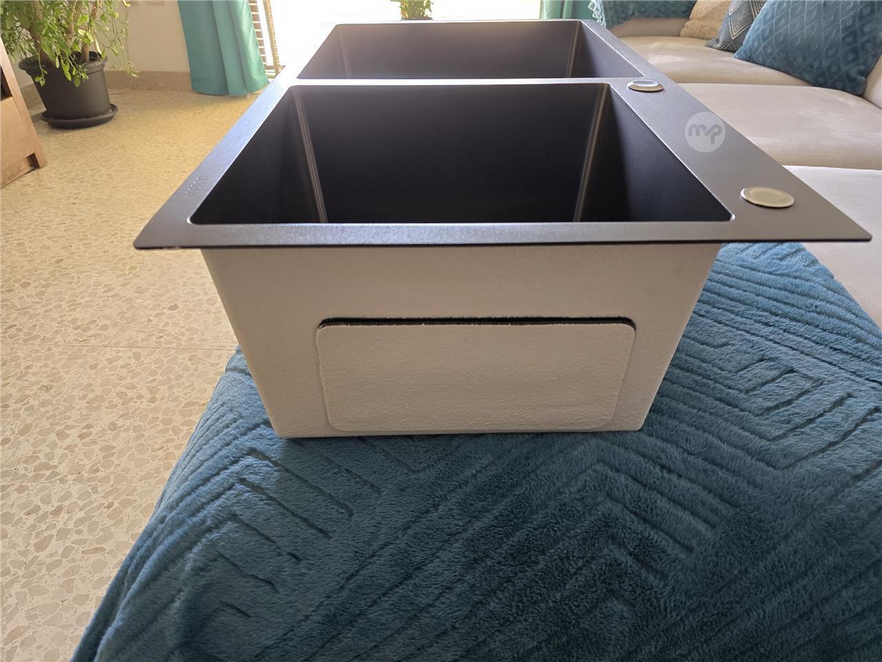 Brand new stainless steel double sink in charcoal grey/black. Comes with insulation underneath, has 2 precut holes for tap and reverse osmosis. Measurement 80x45x22 cm.