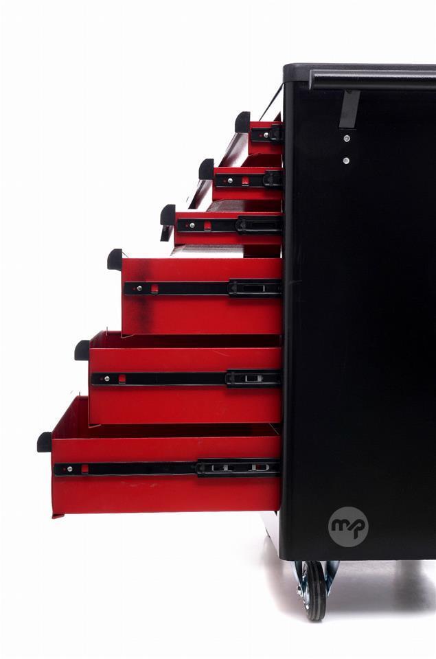 The cabinet features three smaller drawers for small tools and three spacious lower drawers for larger workshop tools .
