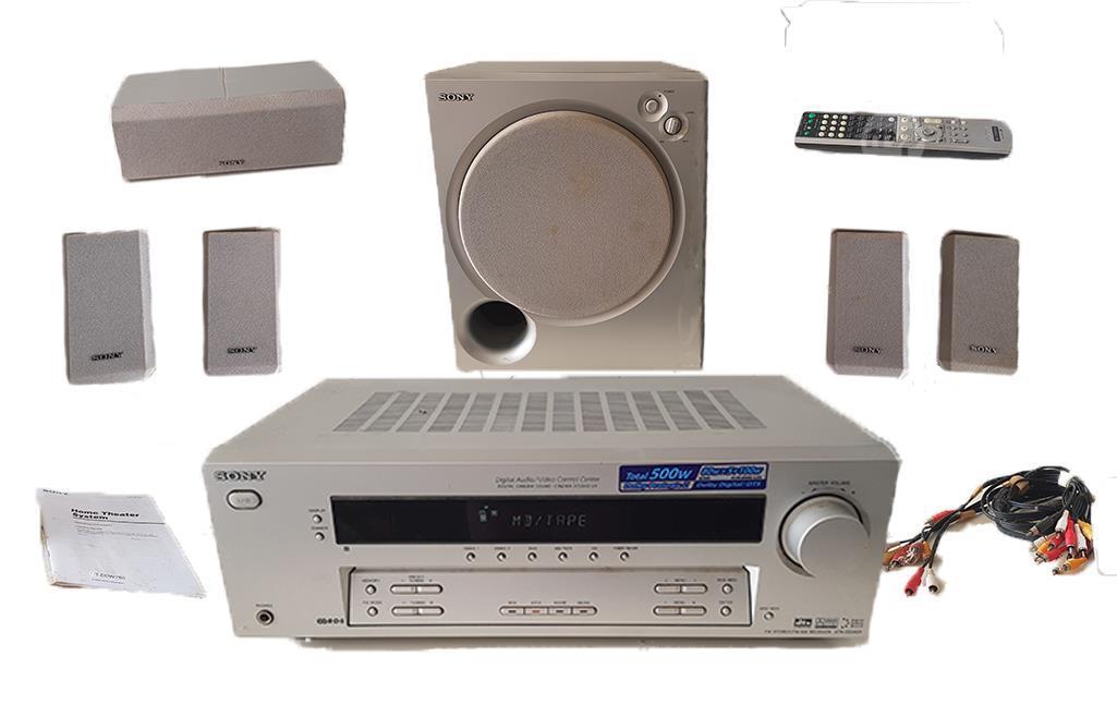 Want to enjoy cinema sound while watching your favorite movies? Sony HT-DDW750 Home Theater Speaker System 5.1 Channel Surround Sound comprising of 500W digital audio/video control center, 5 surround speakers and a 75W sub-woofer. Remote controlled. Also included are two speaker stands which were bought separately. Everything functions well.