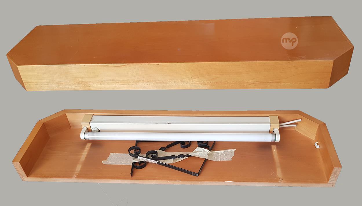 Solid wooden shelf with light fitting, previously used for jewelry display. Size: 89cm X 26cm. 5 in no. Available.