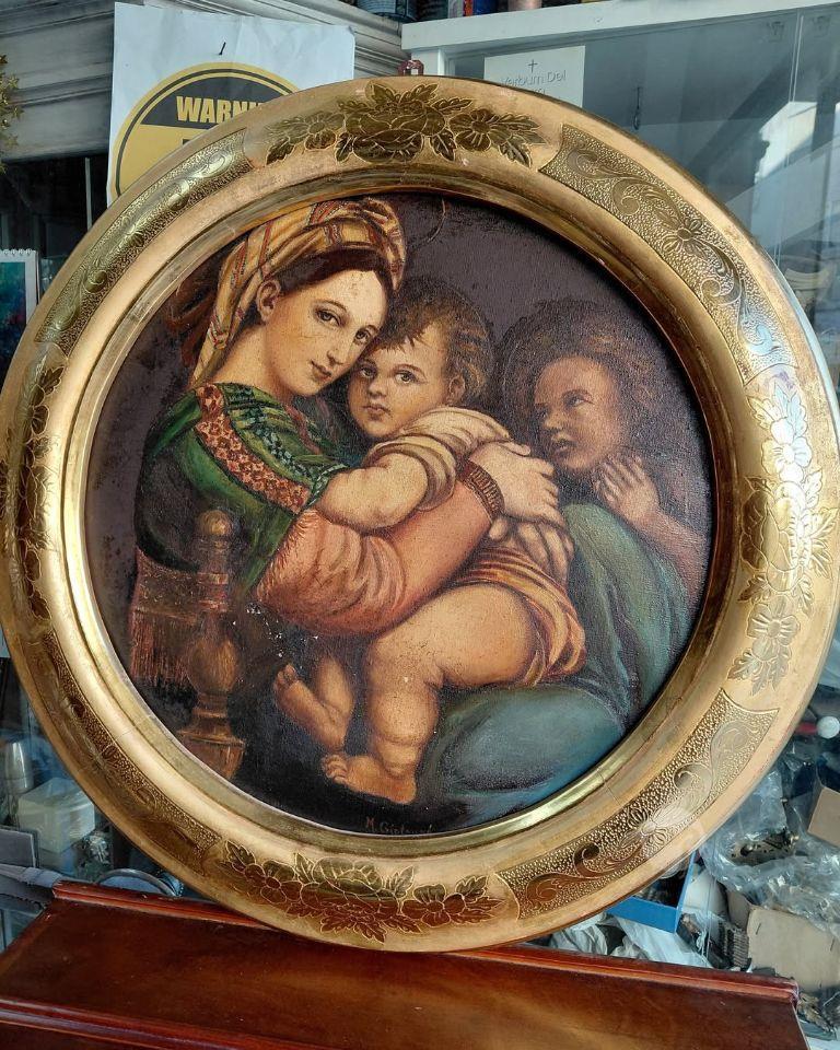 An old oil on canvas painting Showing "Madonna della Seggiola" Mounted on an A