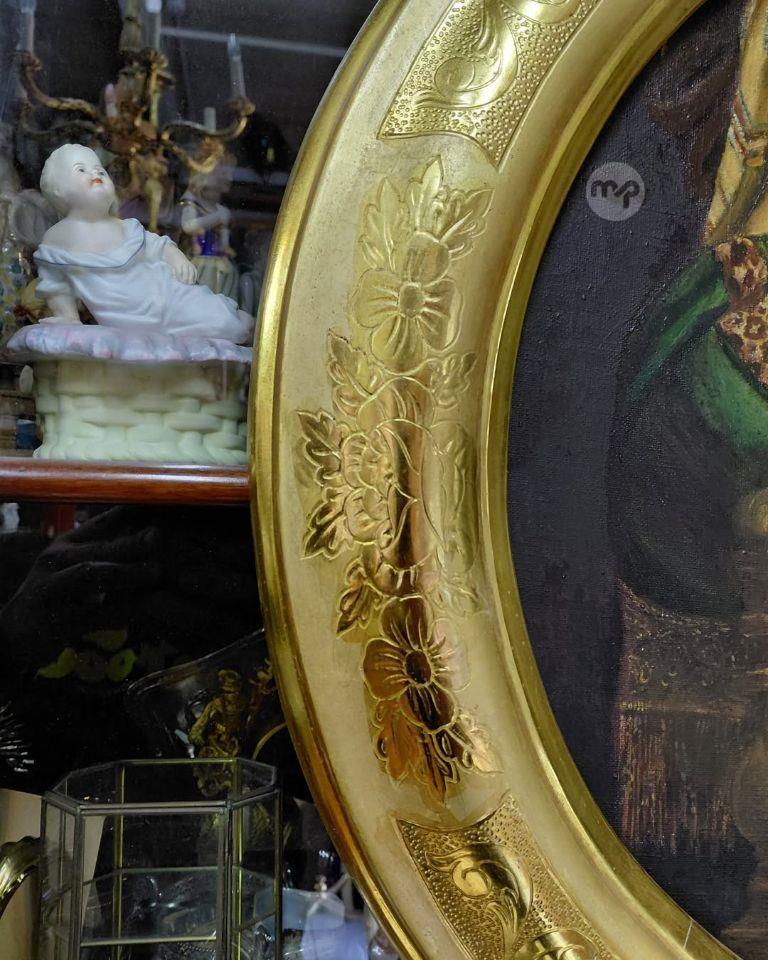 Mounted on an Antique Maltese gold leaf gilded carved wood round frame