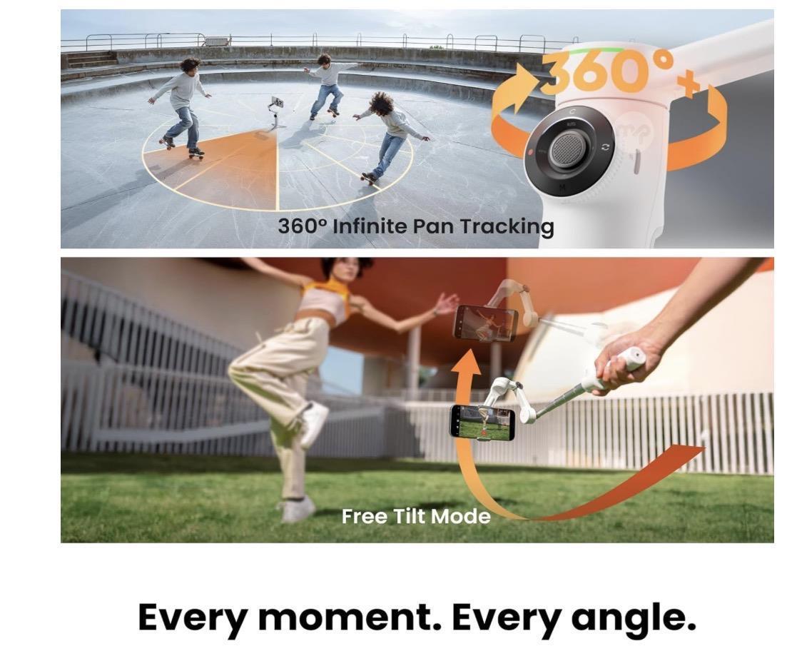 360° Infinite Pan Tracking: Move freely and stay in the picture with the first foldable 360° gimbal. With a continuous swivel motion, the Flow 2 Pro seamlessly tracks your every move.